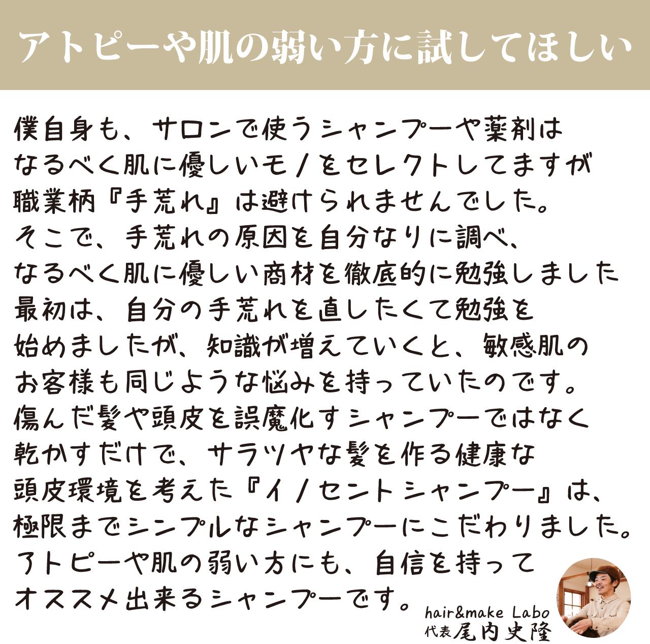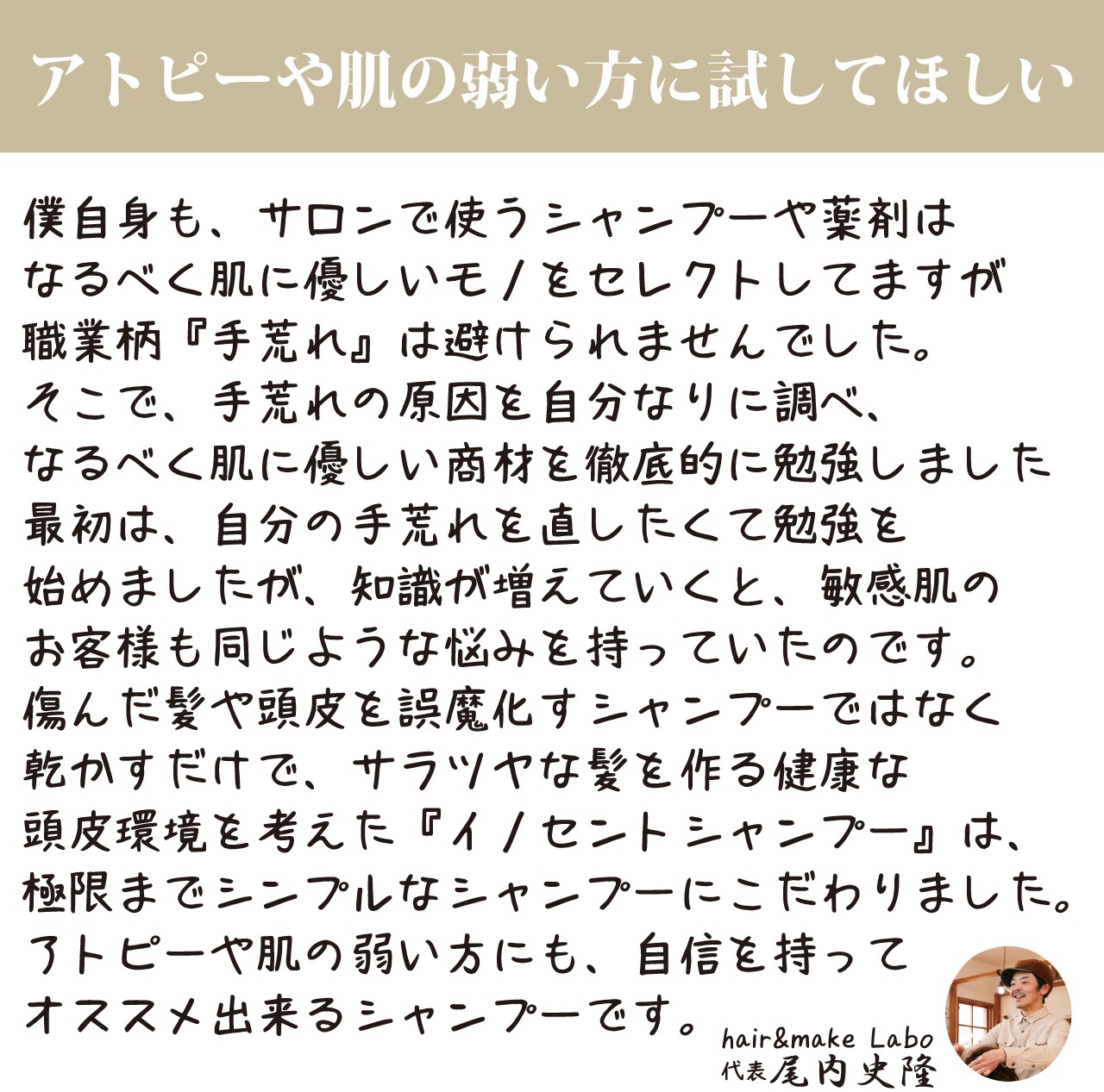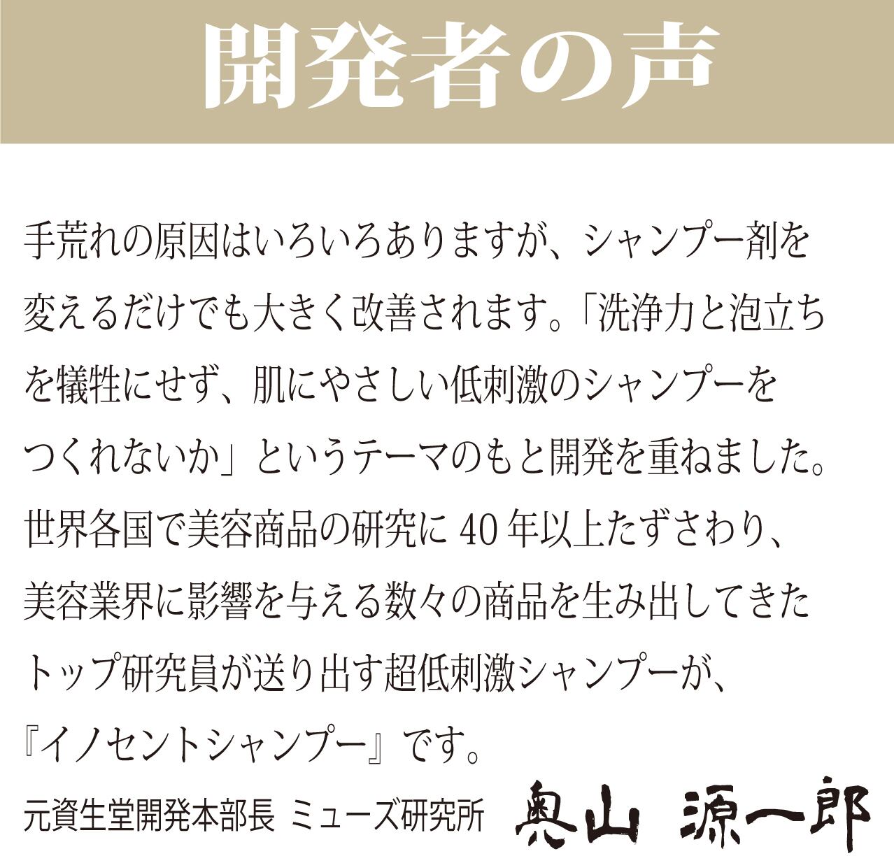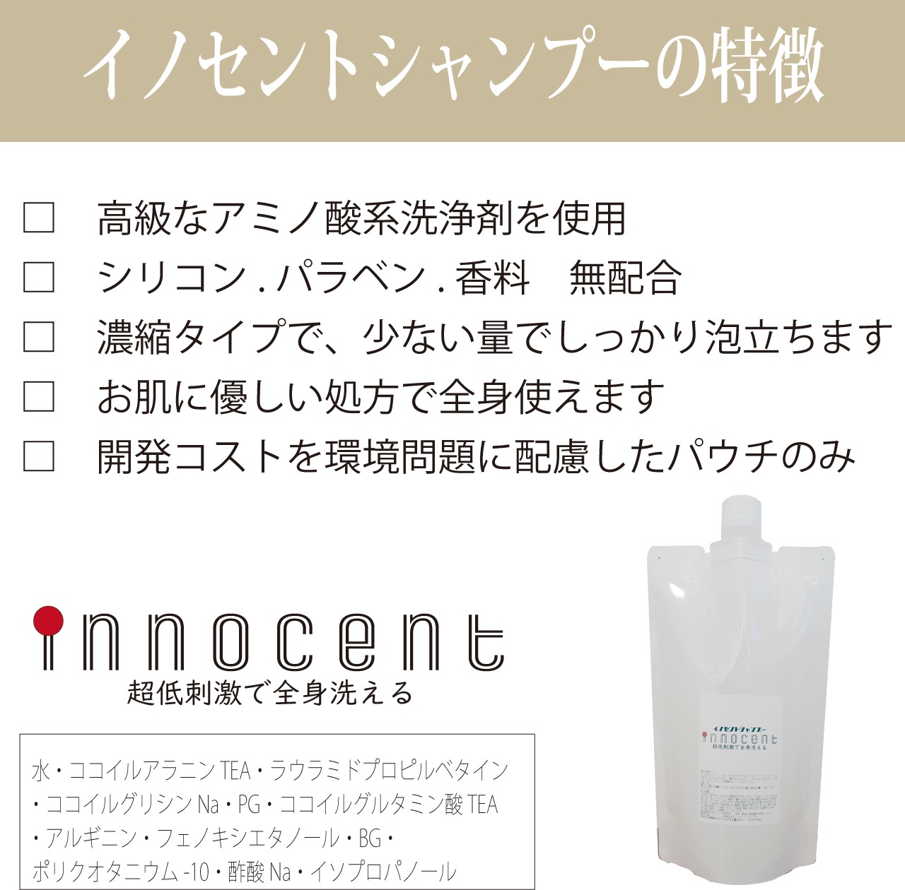 イノセントシャンプーは、髪と頭皮を自然な状態にもどすためのアミノ酸系ノンシリコンシャンプーです。