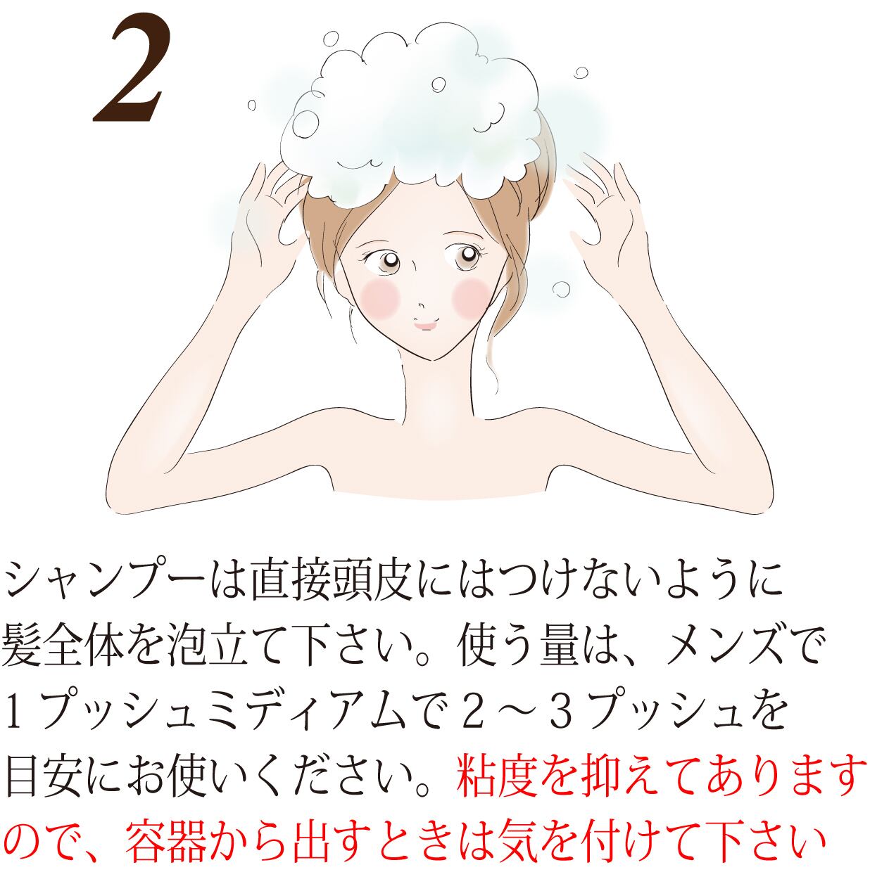※これまで洗浄力の高いシャンプーや、シリコンの入ったトリートメントをお使いになられている場合は、最初泡立ちが悪くなる可能性があります。泡が立たない場合は1度、洗い流しもう一度シャンプーしてみて下さい。